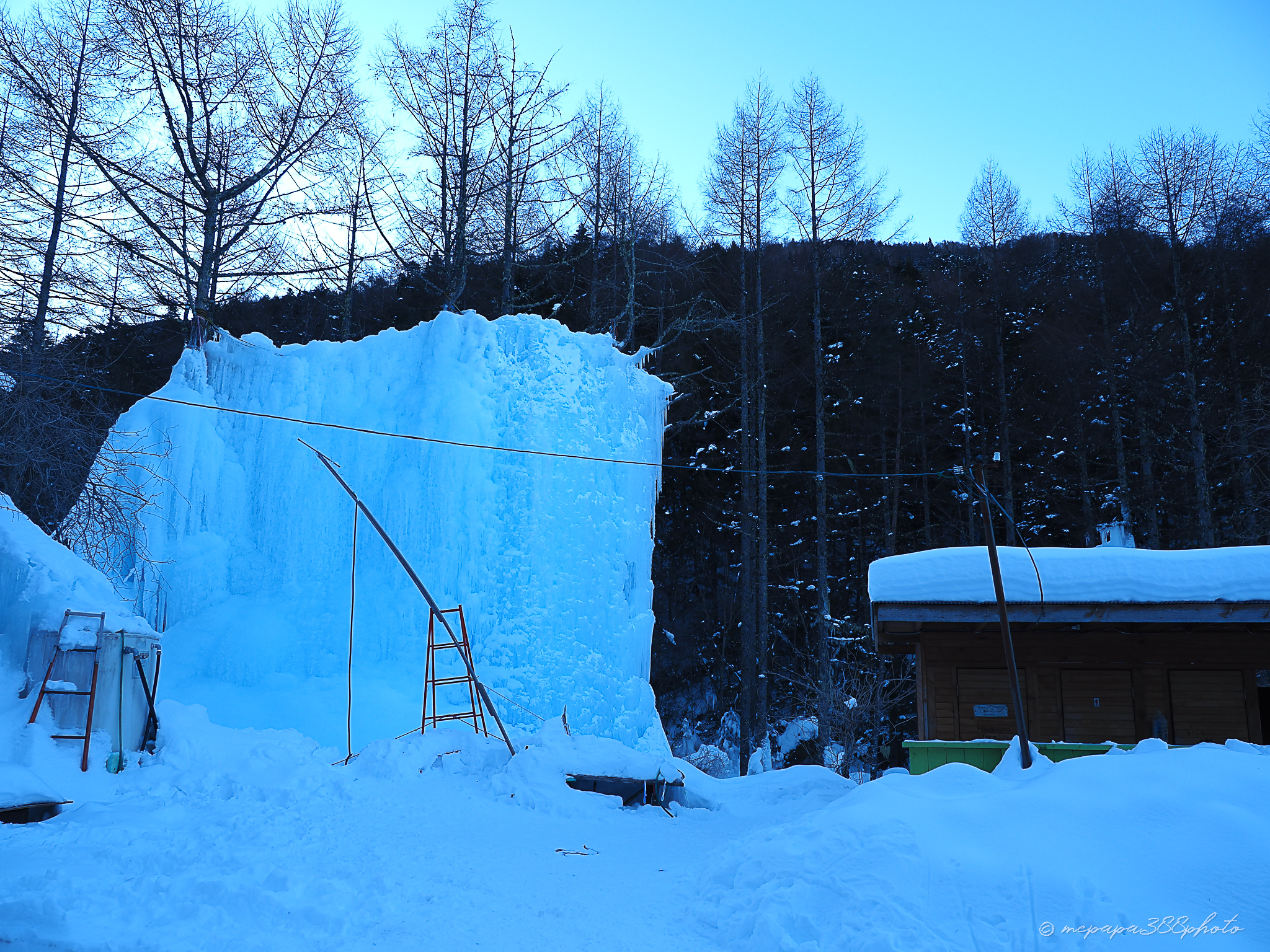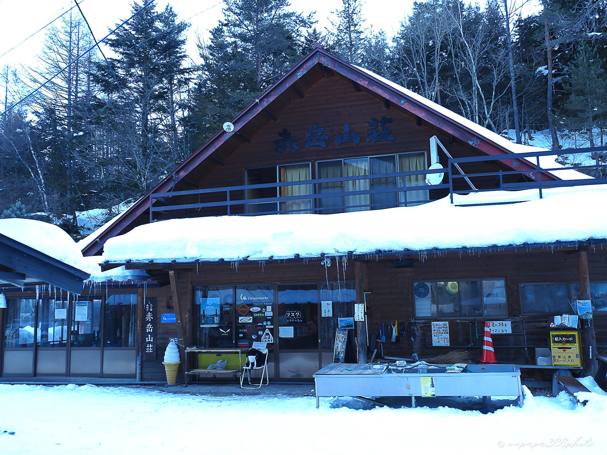 雪の林道を歩くこと約40分、赤岳山荘に到着。アイスキャンディーはしっかり育っている様子。この区間はしっかり歩かれているのですがノーアイゼンかチェーンか12本か悩むところ。今回はノーアイゼンで行者小屋まで行きましたが、歩かれているだけに踏み固められてツルツルになっている部分もあってアイゼンがあると安心ではあります。ただあくまで今回は登りはノーアイゼンで。下りは12本付けたまま八ヶ岳山荘まで下りました。こういう林道歩きでツルンといってしこたま腰を打ったりすることがありますからこの辺りは何度も歩いて状況と道具の選択を上手に出来るようになるといいですね。