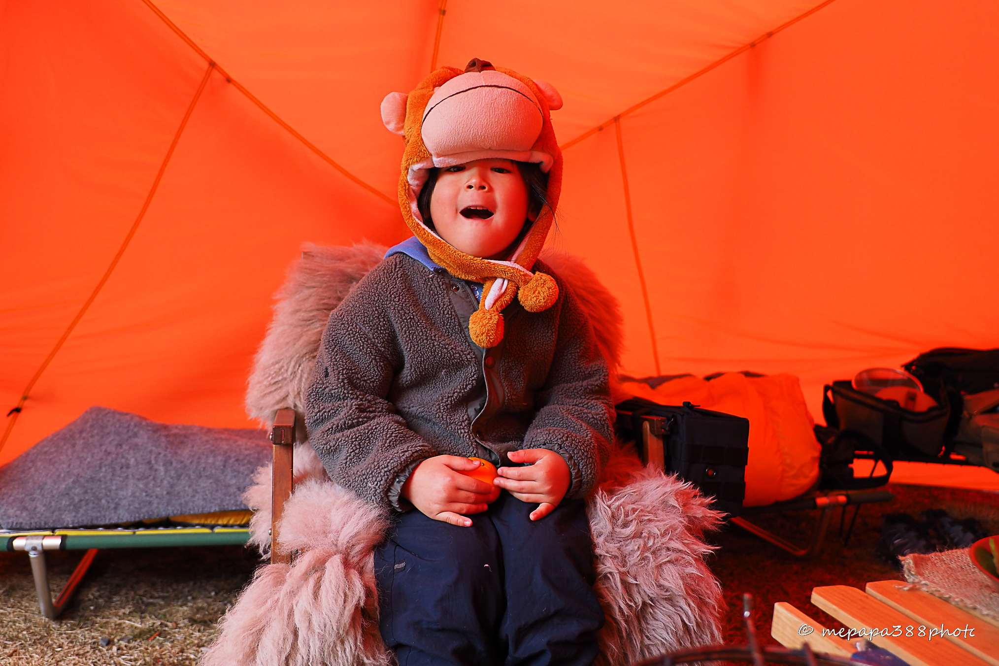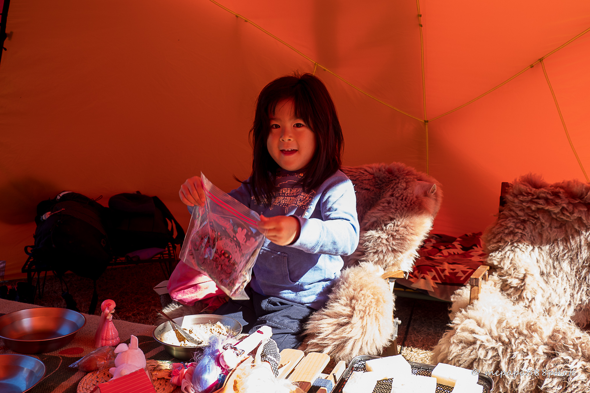 パパっとアトラスを設営していると走る車から「おーい」と声がかかります。今回もたなばた子さんご家族とご一緒出来ました。